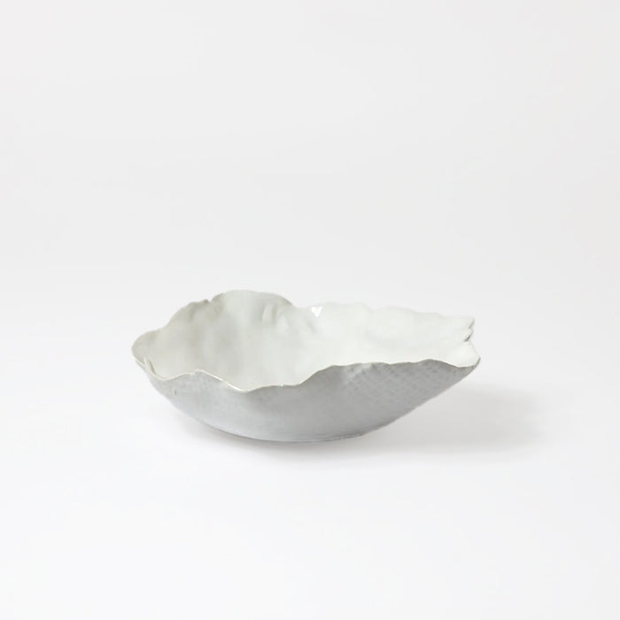 Dette lille fad er håndlavet i keramik og har et enkelt, tidløst udtryk med fine variationer i overfladen, der gør hvert stykke unikt. Den hvide glasur giver et rent og roligt look, som passer smukt ind i både klassiske og mere rustikke borddækninger.