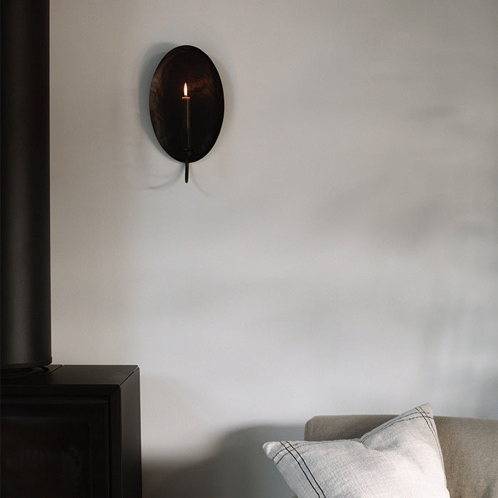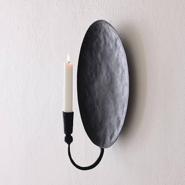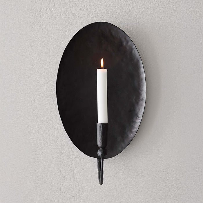 Tidsløs væglysestage, håndlavet i 100 % jern. Med sin ovale bagplade og rustikke finish er stagen klassisk og tilfører hygge til hjemmet