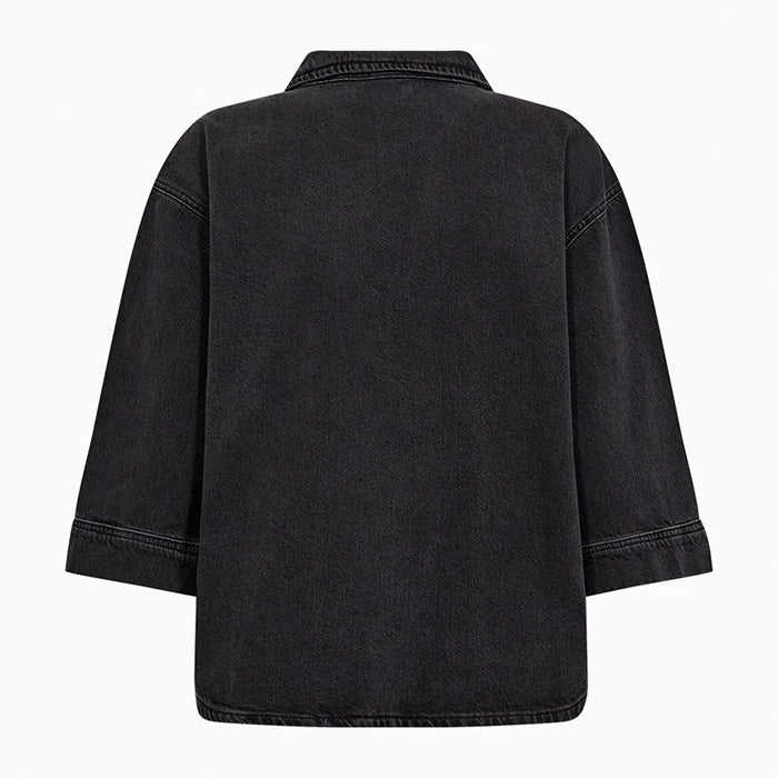Denimskjorte med 3/4-ærmer og en boxy silhuet i vasket sort. Den har en dyb V-udskæring med åben krave.