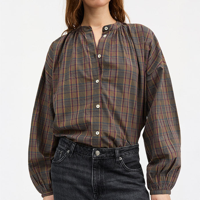 Cilla Shirt kombinerer klassisk skjortestil med et feminint twist. Skjorten har et levende check-mønster i grønne og røde nuancer – perfekt til at tilføre farve og karakter til dit look. Den har voluminøse lange ærmer, knaplukning foran, brystlomme og manchetter med knap, hvilket giver den et tidløst og elegant udtryk.