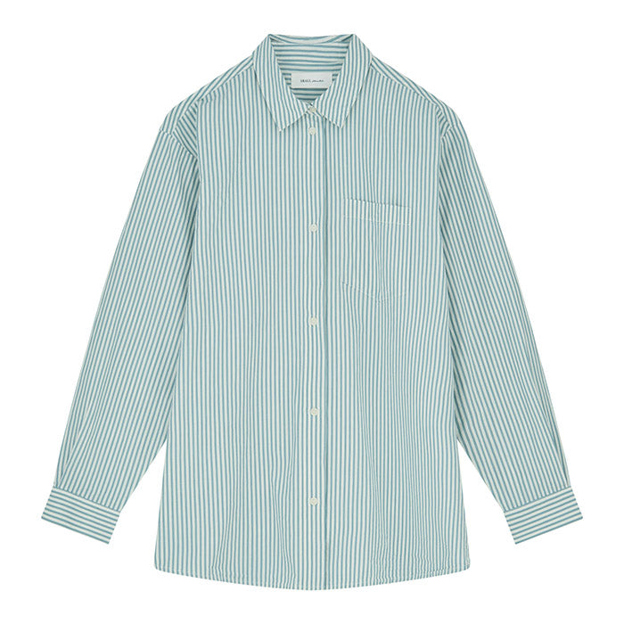 Skjorten har en traditionel krave, knaplukning hele vejen ned, lange ærmer med manchetter samt en praktisk brystlomme. En bred læg i ryggen giver ekstra volumen og understreger skjortens afslappede, oversized pasform.