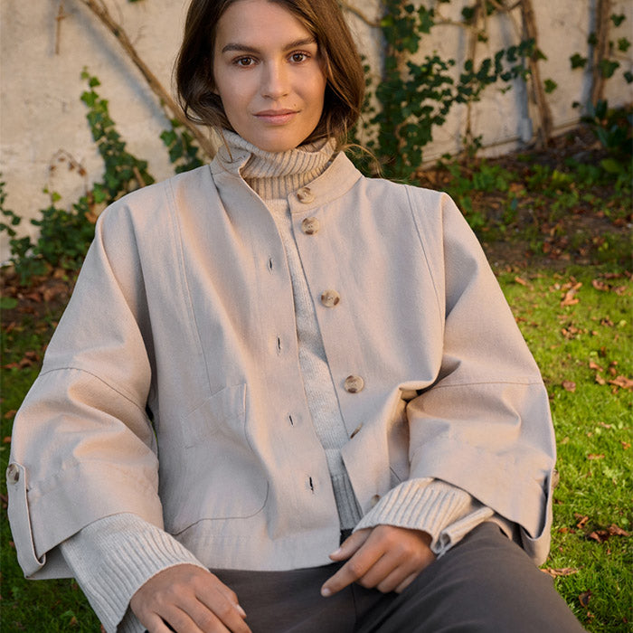 Kort skjortejakke i kraftig bomuldscanvas. Jakken har en let oversized pasform, der gør den perfekt til lag-på-lag med en varm strik under.