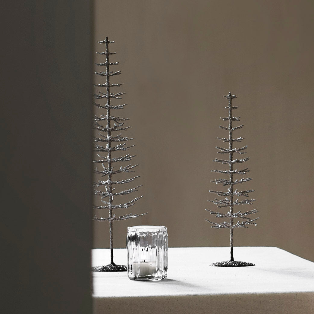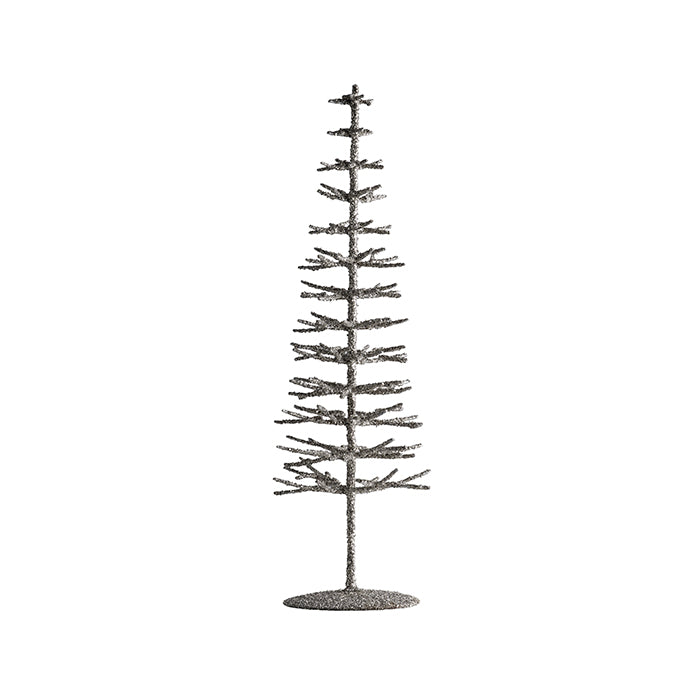 Juletræ belagt med sølvglimmer af spejlstøv - fin i vinduet eller på julebordet. Træet er del af en serie bestående af stjerne, sløjfer og fugle i flere størrelser - alle med sølvglimmer
