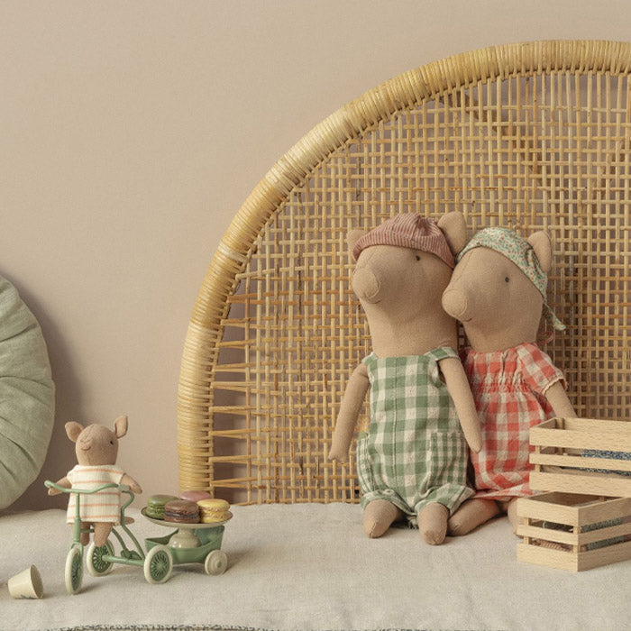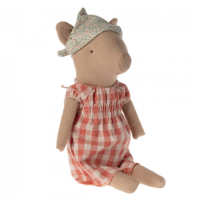 Den sødeste Maileg pige gris med fin ternet kjole og tørklæde. Grisen kan sidde selv og indbyder til hyggelig leg. Lav din grise familie ved at tilføje flere familiemedlemmer.