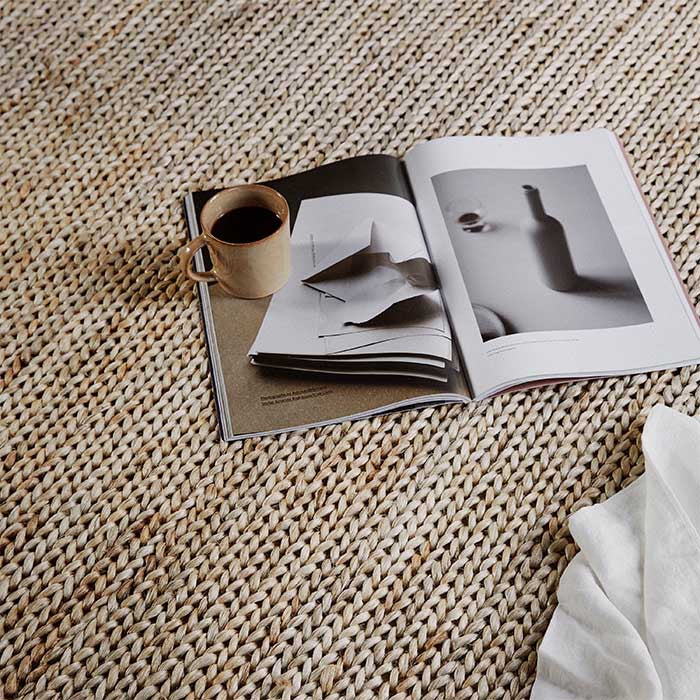 Håndlavet hamp-tæppe med en tydelig flettet struktur. Materialets robusthed og smudsafvisende egenskaber lover lang holdbarhed, mens den håndvævede kvalitet giver et tidløst og organisk touch til hjemmet.