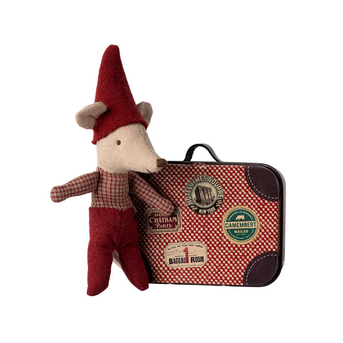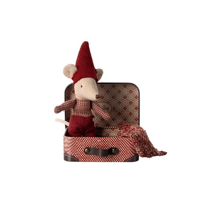 Lille babymus i juletøj, pakket i en lille metalkuffert, så den er nemt at tage med. I kufferten er også et lille tæppe til rejsen.