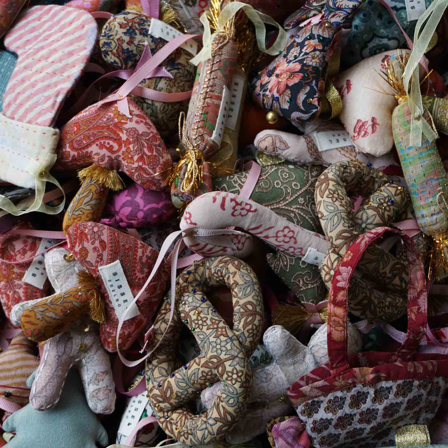 Lykkepose med assorterede ornamenter af vintage tekstiler - ideel til et personligt julehjem.