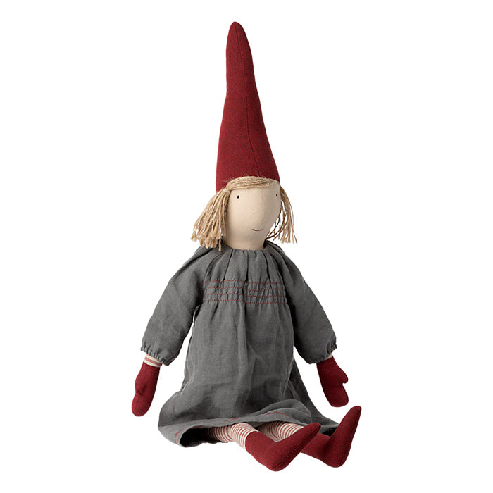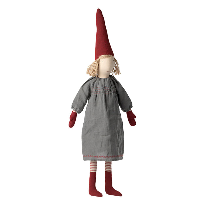En af de store julenisser i Mailegs juleunivers. Denne nissepige har en sød grå julekjole på med fine læg foran. Pixy nisserne kommer i flere størrelser og varianter, som alle kan bruges til at skabe hygge i dit julehjem.