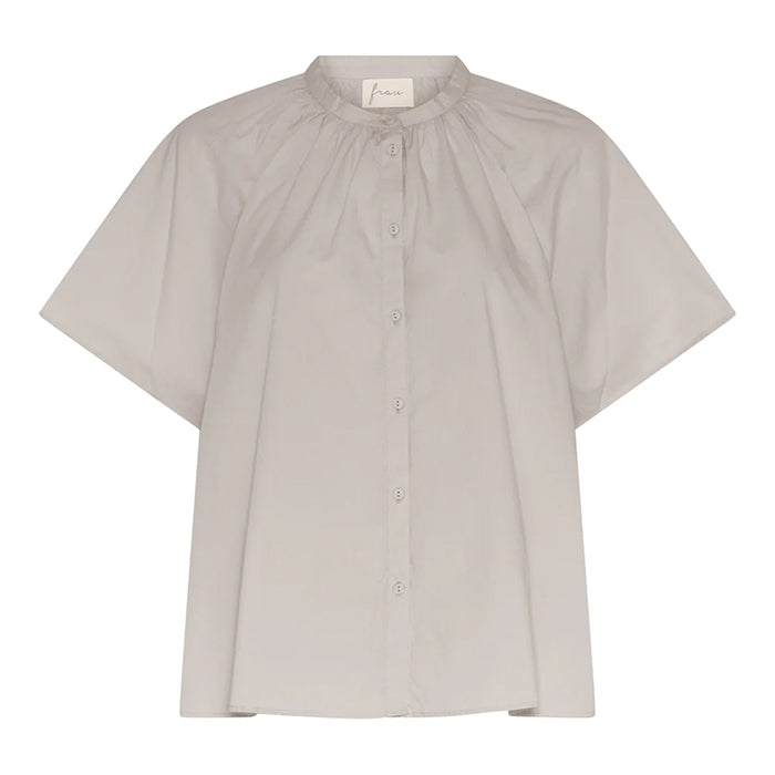 En let og feminin kortærmet skjorte med et afslappet udtryk, der gør den nem at bruge i hverdagen. Den har raglan ærmer, kinakrave og feminine rynker ved skulder og halsskæringen. Skjortens enkle silhuet gør den alsidig i garderoben.
