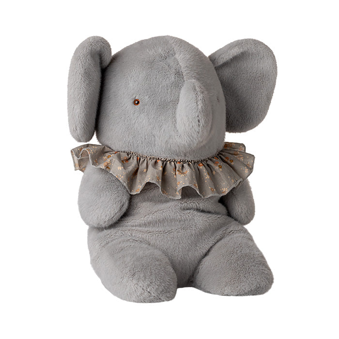 Sødeste plyselefant i blødt gråt stof med en sød mønstret flæsekrave